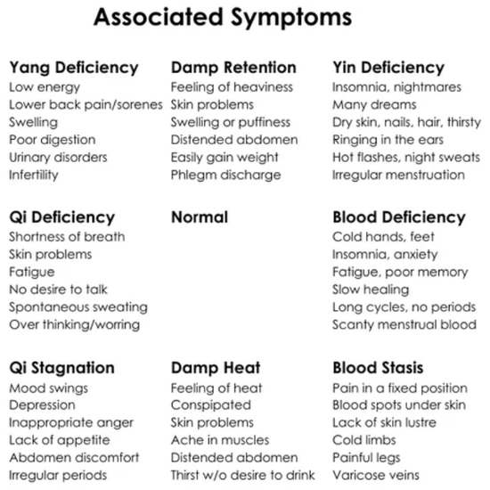 There are specific symptoms associated with each tongue type. For example, a Red Tongue With Little or No Coating means there is Yin Deficiency in the body; hot flashes or night sweats may occur...